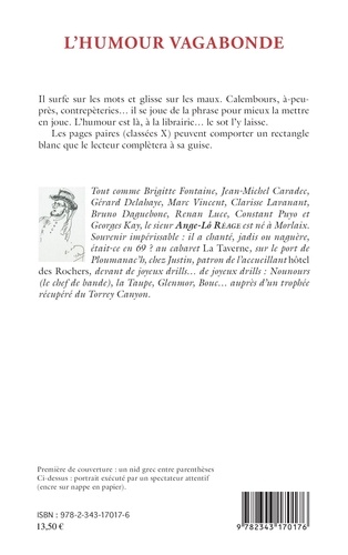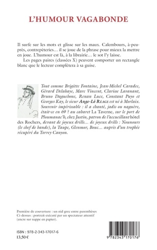 Il surfe sur les mots et glisse sur les maux. Calembours, à-peuprès, contrepèteries… il se joue de la phrase pour mieux la mettre en joue. L'humour est là, à la librairie… le sot l'y laisse. Les pages paires (classées X) peuvent comporter un rectangle blanc que le lecteur complètera à sa guise.