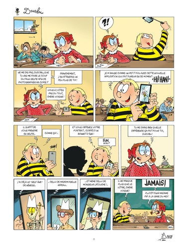 Puisque la musique adoucit les mœurs, Ducobu pourrait bien en user pour amadouer sa célèbre voisine de classe… Encore un nouveau moyen imparable de tricher ! Même si cela ne plaira certainement pas à Mademoiselle Rateau qui prodigue ses cours de musique avec entrain.