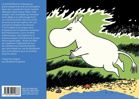La famille Moomin embarque au grand complet à bord de son hélicoptère favori avec le projet de trouver l'endroit idéal pour pique-niquer. Mais c'était compter sans la tempête qui menaçait et les oblige à un atterrissage forcé sur une île inconnue. Dès lors, privés de vivres et de tous repères, les voici contraints d'explorer les environs. C'est le début d'une longue série d'aventures où l'on découvre l'existence des Protomoomins, leurs ancêtres préhistoriques, mais également la présence toujours menaçante de pirates dans le grand targe... Autant de défis qui requièrent l'ingéniosité de tous les membres de la famille Moomin pour être relevés sur une île décidément bien moins déserte qu'il ne semblait de prime abord.