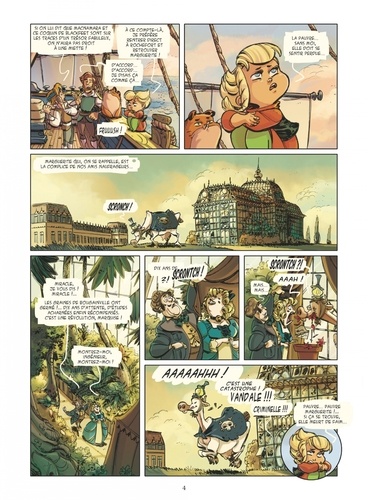 "Ces deux-là... même en enfer, ils feraient la fête". Alix et Germain sont parvenus à sauver leur frère Arsène et les voilà maintenant embarqués tous ensemble sur l'Hermione. Plus question de partir pour Rochefort dorénavant ! Toutes voiles dehors, le fier galion est lancé à pleine vitesse sur les traces de Macnamara et Blackfleet. Les deux couards anglais ont pris la fuite en pleine bataille et ont rejoint une nouvelle frégate. L'honneur bafoué mais la vie sauve, ils continuent de voguer vers l'île de Marie-Galante, sur la piste d'un trésor Inca autrefois abandonné par les conquistadors. Nul doute qu'Arsène et Alix, ces deux gentils avares, feront tout pour les rattraper et mettre en premier la main sur le pactole. Entre humour, action et récit maritime, Frédéric Brrémaud poursuit sa série tout public qui fleure bon les embruns et la piraterie. Une aventure enlevée, rendue moderne par le dynamisme tout en rondeur de Giovanni Rigano, talent émérite de l'écurie Disney.