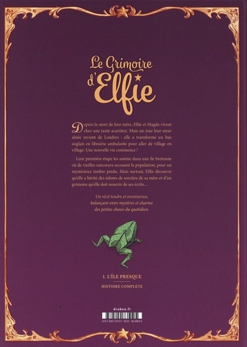 Depuis la mort de leur mère, Elfie et Magda vivent chez une tante acariâtre. Mais un jour leur soeur aînée revient de Londres : elle a transformé un bus anglais en librairie ambulante pour aller de village en village : Une nouvelle vie commence ! Leur première étape les amène dans une île bretonne où de vieilles rancoeurs secouent la population, pour un mystérieux timbre perdu. Mais surtout, Elfie découvre qu'elle a hérité des talents de sorcière de sa mère et d'un grimoire qu'elle doit nourrir de ses écrits... Un récit tendre et aventureux, balançant entre mystères et charme des petites choses du quotidien.