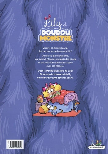 Qu'est-ce qui est grand, fort et qui se cache sous le lit ? Qu'est-ce qui est goinfre, qui sent drôlement mauvais des pieds et qui sait faire des bulles-coeur avec ses fesses ? C'est le Doudoumonstre de Lily ! Et un copain comme celui-là, on n'en trouve pas tous les jours.