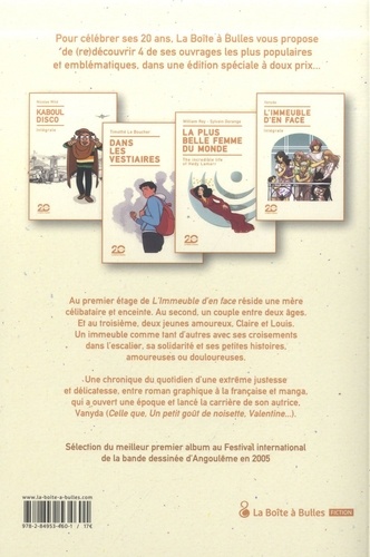 Un Immeuble, trois appartements, trois étages. Au premier vit Béatrice, une maman célibataire, enceinte de son second enfant. Au second, un couple d'une bonne quarantaine, Fabienne et Jacky, qui n'a pas d'enfant mais un gros chien ! Enfin au troisième logent deux jeunes tourtereaux, Claire et Louis, tous deux étudiants. Chacun de ces groupes mène son existence propre, avec ses joies, ses lassitudes, ses jalousies, ses drames. Et les hasards de la vie les font se croiser, s'entraider, voire se désirer... Pour ses 20 ans, La Boîte à Bulles propose une édition anniversaire, à tirage limité et doux prix, de L'Immeuble d'en face, cette saga de presque 500 pages qui a révélé Vanyda (Un petit goût de noisette, Valentine...) et contribué à lancer le manga à la française (30. 000 exemplaires vendus).