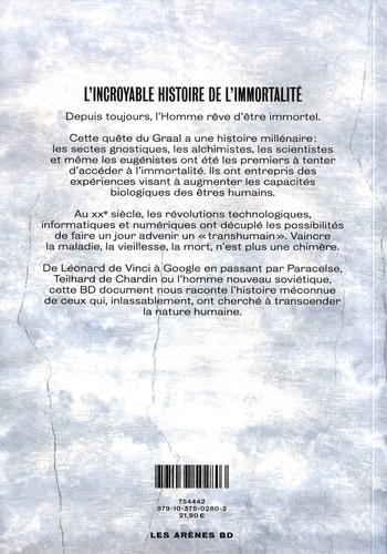 Depuis toujours, l'Homme rêve d'être immortel. Cette quête du Graal a une histoire millénaire : les sectes gnostiques, les alchimistes, les scientistes et même les eugénistes ont été les premiers à tenter d'accéder à l'immortalité. Ils ont entrepris des expériences visant à augmenter les capacités biologiques des êtres humains. Au XXe siècle, les révolutions technologiques, informatiques et numériques ont décuplé les possibilités de faire un jour advenir un "transhumain". Vaincre la maladie, la vieillesse, la mort, n'est plus une chimère. De Léonard de Vinci à Google en passant par Paracelse, Teilhard de Chardin ou l'homme nouveau soviétique, cette BD document nous raconte l'histoire méconnue de ceux qui, inlassablement, ont cherché à transcender la nature humaine.