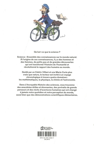 Science : Ensemble des connaissances sur le monde naturel. A l'origine de ces connaissances, il y a des hommes et des femmes, de petits pas et de grandes découvertes qui ont transformé l'histoire de l'humanité et révolutionné le rapport des humains au monde. Guidé par un Cédric Villani et une Marie Curie plus vrais que nature, le lecteur est invité à un voyage chronologique à travers quatre domaines : les mathématiques, la physique, la chimie et l'astronomie. Dans L'Incroyable Histoire des sciences, vous trouverez des anecdotes drôles et étonnantes, des portraits de grands penseurs et des récits d'aventures humaines qui ont changé à jamais notre quotidien et notre perception du monde, aussi bien que des démonstrations scientifiques élémentaires.
