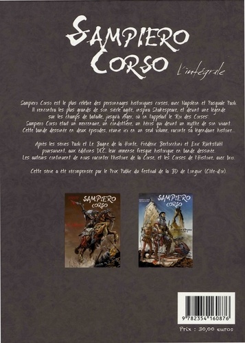 Sampiero Corso est le plus célèbre des Personnages historiques corses, avec Napoléon et Pasquale Paoli. Il rencontra les plus grands de son siècle agité, inspira Shakespeare, et devint une légende sur les champs de bataille jusqu'à Alger, où on l'appelait le "roi des corses". Sempiero Corso était un mercenaire, un condottiere, un héros qui devint un mythe de son vivant. Cette bande dessinée en deux épisodes, réunie ici en un seul volume, raconte sa légendaire histoire... Après les séries Paoli et Le Bagne de la honte, Frédéric Bertocchini et Eric Ruckstuhl poursuivent, aux éditions DLC, leur immense fresque historique en bande dessinée. Les auteurs continuent de nous raconter l'histoire de la Corse, et les Corses de l'histoire, avec brio. Cette série a été récompensée par le Prix Public du festival de la BD de Longvic (Côte-d'or).
