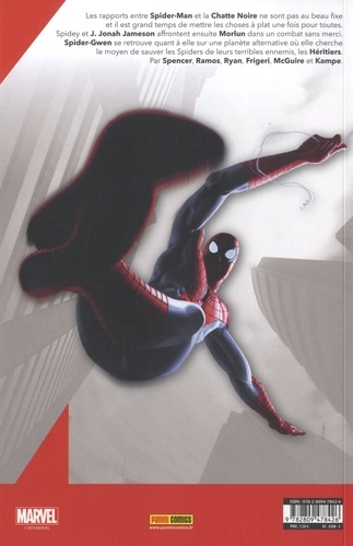 Les rapports entre Spider-Man et la Chatte Noire ne sont pas au beau fixe et il est grand temps de mettre les choses à plat une fois pour toutes. Spidey et J. Jonah Jameson affrontent ensuite Morlun dans un combat sans merci. Spider-Gwen se retrouve quant à elle sur une planète alternative où elle cherche le moyen de sauver les Spiders de leurs terribles ennemis, les Héritiers. Par Spencer, Ramos, Ryan, Frigeri, McGuire et Kampe. Spider-Geddon ! Retrouvez trois épisodes en lien avec la spider-saga de l'été : deux de Spectacular Spider-Man et un autre de Spider-Gwen. Et fin de l'histoire avec la Chatte Noire et Peter Parker dans deux épisodes explosifs !