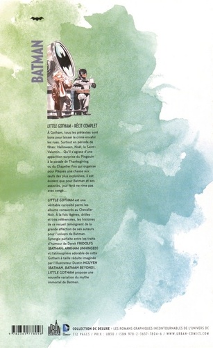 A Gotham, tous les prétextes sont bons pour laisser le crime envahir les rues. Surtout en période de fêtes : Halloween, Noël, la Saint-Valentin... Qu'il s'agisse d'une apparition surprise du Pingouin à la parade de Thanksgiving ou du Chapelier Fou qui organise pour Pâques une chasse aux oeufs des plus explosives, il est évident que pour Batman et ses associés, jour férié ne rime pas avec congé... Little Gotham est une véritable curiosité parmi les albums consacrés au Chevalier Noir. A la fois légères, drôles et très référencées, les histoires de ce recueil témoignent de la grande affection de ses auteurs pour l'univers de Batman. Synergie parfaite entre les traits d'humour de Derek Fridolfs (Batman : Arkham Unhinged) et l'atmosphère adorable de cette Gotham à taille réduite imaginée par l'illustrateur Dustin Nguyen (Batman, Batman Beyond), Little Gotham propose une nouvelle variation du mythe immortel de Batman.