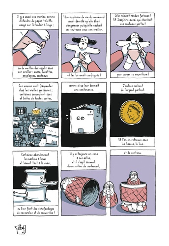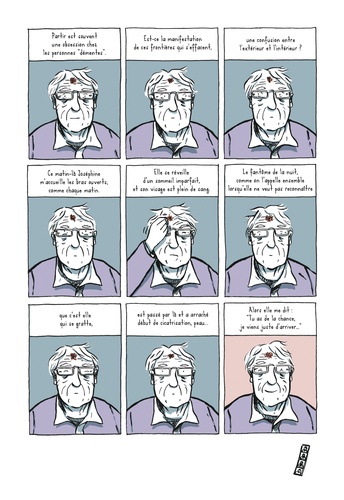 C'est l'aventure éminemment humaine de la complicité d'une infirmière avec une de ses patientes atteinte de dégénérescence sénile, que Valérie a demandé à Raphaël Sarfati de mettre en images, pour témoigner de son vécu et surtout du peu d'attention trop souvent portée aux personnes âgées. "Je suis comme un bout de bois, je regarde le ciel, les nuages, et je ne sens rien " m'a dit un jour Joséphine. J'ai eu la chance de la rencontrer, elle, qui se disait la fille d'Arsène Lupin ! L'humour était notre langage, notre terrain de jeu et notre lien. Elle était drôle et étonnamment vivante malgré les troubles dont elle souffrait. Joséphine a questionné des choses essentielles pour moi, m'a aidée à mieux penser mon travail pour ne pas me perdre dans la passivité, l'indifférence. Par ce récit, je voudrais dire qu'il ne faut jamais capituler face à ces troubles du comportement si déstabilisants pour nous "bien portants". Il faut toujours chercher le lien, la porte qui nous permet d'accéder à l'autre. Et là, on peut être prêt à se laisser bouleverser par " la demoiselle aux yeux verts " Emouvant et riche de questionnements.