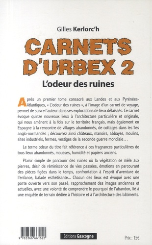 Après un premier tome consacré aux Landes et aux Pyrénées-Atlantiques, "L'odeur des ruines" , à l'image d'un carnet de voyage, permet de suivre l'auteur dans ses explorations de lieux délaissés. Ce carnet évoque quinze nouveaux lieux à l'architecture particulière et originale, qui nous amènent à la fois sur le territoire français, mais également en Espagne à la rencontre de villages abandonnés, de cottages dans les îles anglo-normandes ; découvrez ainsi châteaux, manoirs, abbayes, moulins, sites industriels, fermes, vestiges de la seconde guerre mondiale... Le terme odeur du titre fait référence à ces fragrances particulières de tous lieux abandonnés, mousses, humidité et papiers anciens. Plaisir simple de parcourir des ruines où la végétation se mêle aux pierres, désir de réminiscence de vies passées, émotions en parcourant des pièces figées dans le temps, confrontation à l'esprit d'aventure de l'enfance, balade esthétisante... Chacun des lieux est évoqué avec une porte ouverte vers son passé, rapprochement des images anciennes et actuelles, avec une volonté de comprendre le pourquoi de l'abandon, lié à une enquête de terrain dédiée à l'histoire et à l'architecture des bâtiments.