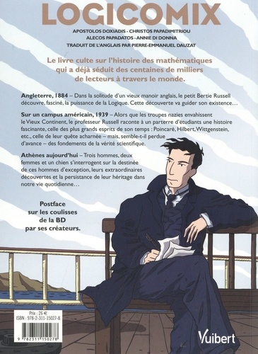 Le roman graphique culte sur l'histoire des mathématiques, qui a déjà séduit des centaines de milliers de lecteurs à travers le monde, et plus de 35 000 en France depuis 2010, réédité avec sa postface de 2018 sur les coulisses de la BD. Angleterre, 1884 - Dans la solitude d'un vieux manoir anglais, le petit Bertie Russell découvre, fasciné, la puissance de la Logique. Cette découverte va guider son existence... Sur un campus américain, 1939 - Alors que les troupes nazies envahissent le Vieux Continent, le professeur Russell raconte à un parterre d'étudiants une histoire fascinante, celle des plus grands esprits de son temps : Poincaré, Hilbert, Wittgenstein, etc. , celle de leur quête acharnée - mais, semble-t-il perdue d'avance - des fondements de la vérité scientifique. Athènes aujourd'hui - Trois hommes, deux femmes et un chien s'interrogent sur la destinée de ces hommes d'exception, leurs extraordinaires découvertes et la persistance de leur héritage dans notre vie quotidienne...