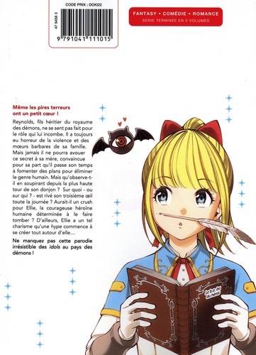 Même les pires terreurs ont un petit coeur ! Reynolds, fils héritier du royaume des démons, ne se sent pas fait pour le rôle qui lui incombe. Il a toujours eu horreur de la violence et des moeurs barbares de sa famille. Mais jamais il ne pourra avouer ce secret à sa mère, convaincue pour sa part qu'il passe son temps à fomenter des plans pour éliminer le genre humain. Mais qu'observe-t-il en soupirant depuis la plus haute tour de son donjon ? Sur quoi - ou sur qui ? - est rivé son troisième oeil toute la journée ? Aurait-il un crush pour Ellie, la courageuse héroïne humaine déterminée à le faire tomber ? D'ailleurs, Ellie a un tel charisme qu'une hype commence à se créer autour d'elle... Ne manquez pas cette parodie irrésistible des idols au pays des démons !