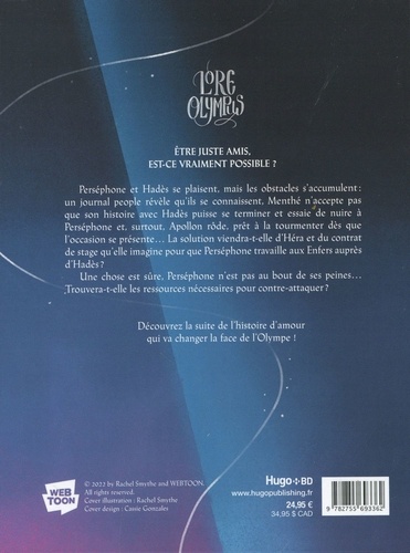 Perséphone et Hadès se plaisent, mais les obstacles s'accumulent : un journal people révèle qu'ils se connaissent, Menthé n'accepte pas que son histoire avec Hadès puisse se terminer et essaie de nuire à Perséphone et, surtout, Apollon rôde, prit à la tourmenter dès que l'occasion se présente... La solution viendra-t-elle d'Héra et du contrat de stage qu'elle imagine pour que Perséphone travaille aux Enfers auprès d'Hadès ? Une chose est sûre, Perséphone n'est pas au bout de ses peines... Trouvera-t-elle les ressources nécessaires pour contre-attaquer ? Découvrez la suite de l'histoire d'amour qui va changer la face de l'Olympe !