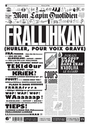 Mon Lapin Quotidien numéro 9 se consacrera exclusivement à : LA COMMODE. C'est à dire à LA COMMODE sur laquelle on trouve mon cul... . Ou pas. MLQ n'oublie JAMAIS de se dire "ou pas" dès qu'il a une idée. MLQ n'est pas le journal des lecteurs qui savent à quoi s'attendre. MLQ est le journal qui n'attend pas de savoir. MLQ est le journal d'une expérience en cours. MLQ est une entreprise qui vise à rendre visible l'imprévisible. MLQ ne tient que les promesses (mais alors : toutes les promesses) qu'il ne fait pas. MLQ réalise soudain que toute tentative de définition est vaine, incomplète, insatisfaisante. MLQ promet désormais de ne plus parler de lui-même qu'au, et seulement au : temps passé... . Ou pas. Ceux que l'on peut quand même espérer trouver dans ce miracle d'équilibre, mille fois tenté et enfin réalisé, entre le monde des mots et celui des images : David B. , Pacôme Thiellement, Denis Robert, Dominique Lestel, Lewis Trondheim, Joko, Corinne Taunay, Phileas Pym, Jean-Yves Duhoo, Vincent Pianina, Rocco, Florence Dupré la Tour, Hervé Le Tellier, Etienne Lécroart, Rudy Spiessert, Charles Berberian, Thomas Baumgartner, François Ayroles, Agnès de Cayeux, Clémentine Mélois, Dorothée de Monfreid, Killoffer, Vincent Vanoli, Denis Bourdaud, Edmond Baudoin, Eric Chevillard, Jochen Gerner, Fabio Viscogliosi, Morvandiau, Alex Baladi, Aurélie William Levaux, Christophe Levaux, Thierry Longé... et puis, et puis... 90 auteurs dans notre numéro 7. Peut-on en faire le tour ? Le doit-on ? Quelqu'un dit-il mieux ? A ces questions, une seule réponse : "NON ! "