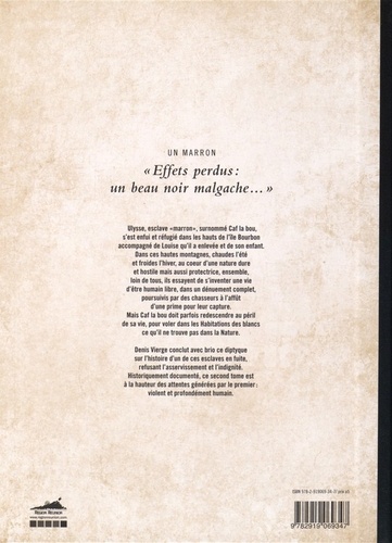 Ulysse, esclave "marron", surnommé Caf la bou, s'est enfui et réfugié dans les hauts de l'île Bourbon accompagné de Louise qu'il a enlevée et de son enfant. Dans ces hautes montagnes, chaudes l'été et froides l'hiver, au coeur d'une nature dure et hostile mais aussi protectrice, ensemble, loin de tous, ils essayent de s'inventer une vie d'être humain libre, dans un dénuement complet, poursuivis par des chasseurs à l'affût d'une prime pour leur capture. Mais Caf la bou doit parfois redescendre au péril de sa vie, pour voler dans les Habitations des blancs ce qu'il ne trouve pas dans la Nature. Denis Vierge conclut avec brio ce diptyque sur l'histoire d'un de ces esclaves en fuite, refusant l'asservissement et l'indignité. Historiquement documenté, ce second tome est à la hauteur des attentes générées par le premier : violent et profondément humain.