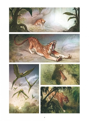 Dans la jungle, merveilles et dangers se côtoient. Certaines créatures s'avèrent parfois même être les deux à la fois : le tigre en fait partie ! Découvrez à travers cet album une illustration ultra réaliste de la chaîne alimentaire, avec tout ce qu'elle comporte de plus fascinant. Panthères, singes, serpents, fourmis, poissons, éléphants... Autant d'images splendides, aussi fidèles que possible au genre du documentaire animalier, qui vous plongent au coeur d'une nature capricieuse, tantôt hostile, tantôt généreuse... Vous envierez la bête pour sa présence, sa patience et sa combativité. Ses échecs, sa solitude et sa tristesse vous la rendront d'autres fois plus humaine... Une BD au silence émouvant, qui devrait vous faire rugir de plaisir !