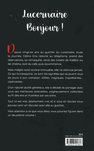 Depuis vingt-six ans au guichet du Lucernaire, toute la journée, Céline Ena répond au téléphone, prend des réservations, se remaquille, vend des tickets de théâtre ou de cinéma, boit du café, puis recommence. Mais malgré cette routine immuable, elle ne s'ennuie jamais. Ce qui la transporte, ce sont les saynètes qui se jouent tous les jours à son comptoir, drôles, tragiques, inquiétantes... captivantes. D'un naturel plutôt généreux, elle a décidé de partager avec vous ses meilleures anecdotes, soigneusement collectées au fil des ans et illustrées par ses soins. Tout ici est vrai, absolument vrai, et si vous en doutez vous pouvez venir en discuter avec elle au guichet. Mais attention à ce que vous direz, vous pourriez figurer dans un deuxième volume !
