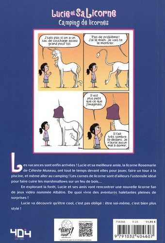 Lucie et sa licorne Rosemarie partent à l'aventure... au camping ! L'école est finie, les vacances peuvent commencer ! Lucie Howell et sa meilleure amie la licorne Rosemarie de Céleste Museau ont désormais du temps devant elles pour jouer, aller à la piscine et surtout... partir au camping ! Les cornes de licorne sont d'ailleurs l'ustensile parfait pour faire griller des marshmallows au coin du feu (même si Lucie n'aime pas ça). Une aventure au coeur de la forêt les attend : exploration des bois, rencontre avec de nouveaux amis et montage de tente ! Lucie et Rosemarie vont même rencontrer une autre licorne, fan d'un mystérieux jeu vidéo... Surtout, Lucie va apprendre qu'être cool, c'est cool, mais qu'être soi-même, c'est mieux ! 10 titres disponibles dans la même collection : Lucie et sa licorne, Comme sur des roulettes, Licorne contre gobelins, Paillettes et poudre aux yeux, Attention traversée de licorne ! , La tempête magique, Une licorne aux multiples casquettes, Le théâtre des licornes et Celle qui murmurait à l'oreille des licornes.