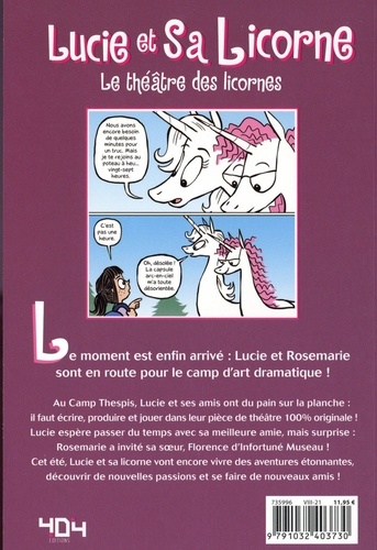Retrouvez Lucie et Rosemarie pour de nouvelles aventures magiques ! Le moment est enfin arrivé : Lucie et Rosemarie sont en route pour le camp d'art dramatique ! Au Camp Thespis, Lucie et ses amis ont du pain sur la planche : il faut écrire, produire et jouer dans leur pièce de théâtre, 100% originale ! Lucie espère passer du temps avec sa meilleure mais surprise : Rosemarie a invité sa soeur, Florence d'Infortuné Museau. Pendant ces vacances, Lucie et sa licorne vont encore vivre des aventures étonnantes, découvrir de nouvelles passions et se faire de nouveaux amis ! Des gags drôles et tendres qui séduiront petits et grands. 10 titres disponibles dans la collection : Lucie et sa licorne, Comme sur des roulettes, Licorne contre gobelins, Paillettes et poudre aux yeux, Attention traversée de licorne ! , La tempête magique, Une licorne aux multiples casquettes, Le théâtre des licornes et Celle qui murmurait à l'oreille des licornes.