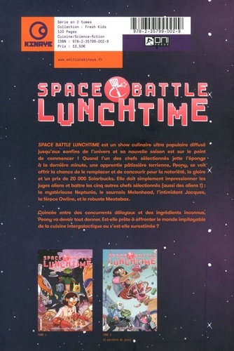 Space Battle Lunchtime est un show culinaire ultra populaire diffusé jusqu'aux confins de l'univers et sa nouvelle saison est sur le point de commencer ! Quand l'un des chefs sélectionnés jette l'éponge à la dernière minute, une apprentie pâtissière terrienne, Peony, se voit offrir la chance de le remplacer et de concourir pour la notoriété, la gloire et un prix de 20 000 Solarbucks. Elle doit simplement impressionner les juges aliens et battre les cinq autres chefs sélectionnés (aussi des aliens ! ) : la mystérieuse Neptunia, le sournois Melonhead, l'intimidant Jacques, la féroce Owline, et le robuste Meatabax. Coincée entre des concurrents déloyaux et des ingrédients inconnus, Penny va devoir tout donner. Est-elle prête à affronter le monde impitoyable de la cuisine intergalactique ou s'est-elle surestimée ?