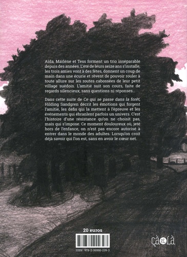 Aïda, Marlène et Tess forment un trio inséparable depuis des années. L'été de leurs seize ans s'installe, les trois amies vont à des fêtes, donnent un coup de main dans une écurie et rêvent de pouvoir rouler à toute allure sur les routes cabossées de leur petit village suédois. L'amitié suit son cours, faite de regards silencieux, sans questions ni réponses... Dans cette suite de Ce qui se passe dans la forêt, Hilding Sandgren décrit les émotions qui forgent l'amitié, les défis qui la mettent à l'épreuve et les événements qui ébranlent parfois un univers. C'est l'histoire d'une résistance qu'on ne choisit pas, mais qui s'impose. Ce moment douloureux où, jeté hors de l'enfance, on n'est pas encore autorisé à entrer dans le monde des adultes. Lorsqu'on croit déjà savoir qui l'on est, sans en avoir le coeur net.