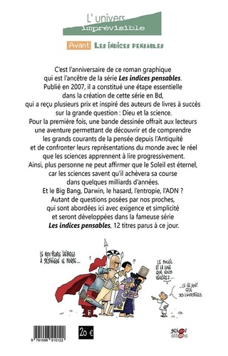 C'est l'anniversaire de ce roman graphique qui est l'ancêtre de la série Les indices pensables. Publié en 2007, il a constitué une étape essentielle dans la création de cette série en Bd, quia reçu plusieurs prix et inspiré des auteurs de livres à sucrés sur la grande question : Dieu et la science. Pour la première fois, une bande dessinée offrait aux lecteurs une aventure permettant de découvrir et de comprendre les grands courants de la pensée depuis l'Antiquité et de confronter leurs représentations du monde avec le réel que les sciences apprennent à lire progressivement. Ainsi, plus personne ne peut affirmer que le Soleil est éternel, car les sciences savent qu'il achèvera sa course dans quelques milliards d'années. Et le Big Bang, Darwin, le hasard, l'entropie, l'ADN ? Autant de questions posées par nos proches, qui sont abordées ici avec exigence et simplicité et seront développées dans la fameuse série Les indices pensables, 12 titres parus à ce jour.