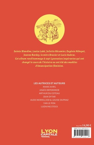 Sainte Blandine, Louise Labé, Juliette Récamier, Eugénie Niboyet, Jeanne Bardey, la mère Brazier et Lucie Aubrac. Cet album rend hommage à sept Lyonnaises inspirantes qui ont changé le cours de l'histoire ou ont été des modèles d'émancipation féminine.