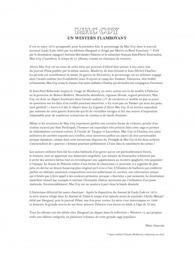 C'est au milieu des années 1970 que l'intrépide lieutenant Alexis Mac Coy fait sa première apparition dans Le Journal de Lucky Luke. Imaginé par Jean-Pierre Gourmelen et Antonio Hernández Palacios, ce western flamboyant et singulier qui se déroule durant la guerre de Sécession connaît aujourd'hui une nouvelle vie grâce à ces éditions intégrales.