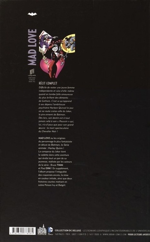 Difficile de rester une jeune femme indépendante et sûre d'elle-même quand on tombe folle amoureuse du plus brillant des déments de Gotham. C'est ce qu'apprend à ses dépens l'ambitieuse psychiatre Harley Quinzel le jour où sa route croise celle du Joker, le pire ennemi de Batman. Dès lors, son destin est à tout jamais reliés à son " Poussin " qui, lui, n'a d'yeux que pour son grand oeuvre : la mort spectaculaire du Chevalier Noir ! Contenu : Mad Love Deluxe Edition + Adventures in the DCU #3 + Batman Holiday Special #1.