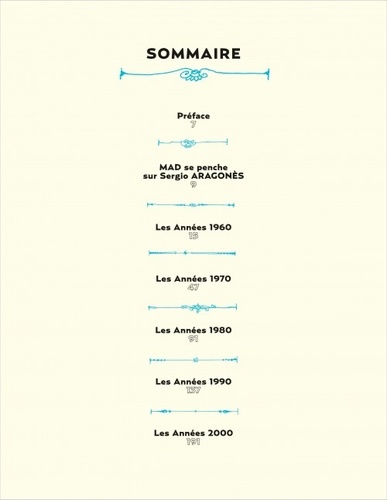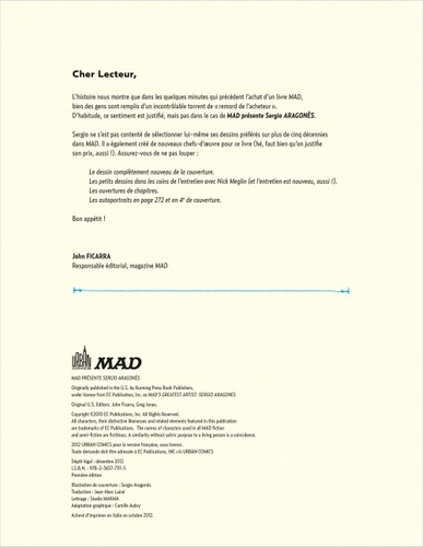 Depuis 1962, date à laquelle son style inimitable a fait son apparition dans les pages de MAD, Sergio Aragonès s'est imposé comme l'un des dessinateurs les plus appréciés de sa génération. Voici un florilège, sélectionné par ses soins, de dessins couvrant un demi-siècle de création. Qu'il s'agisse de sa rubrique "MAD se penche sur..." ou d'une de ses "Marges", ces milliers (oui, milliers !) de petits dessins cachés dans les coins de MAD, découvrez tout l'art de Sergio Aragonès. Cette édition présente également un entretien inédit de l'auteur, mené par Nick Meglib, (ir)responsable éditorial de MAD, et de nombreuses illustrations inédites, réalisées exclusivement pour cet ouvrage. Et même si Sergio Aragonès est considéré par ses pairs comme le dessinateur le plus rapide du monde, nous vous recommandons chaudement de prendre le temps de savourer ces cinq décennies de dessins choisis.