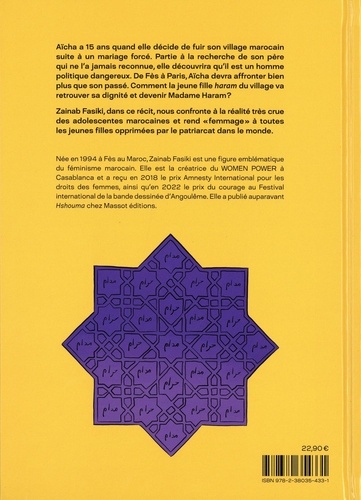 Aicha a 15 ans quand elle décide de fuir son village marocain suite a un mariage forcé. Partie à la recherche de son père qui ne l'a jamais reconnue, elle découvrira qu'il est un homme politique dangereux. De Fès à Paris, Aïcha devra affronter bien plus que son passé. Comment la jeune fille haram du village va retrouver sa dignité et devenir Madame Haram ? Zainab Fasiki, dans ce récit, nous confronte à la réalité très crue des adolescentes marocaines et rend "femmage" à toutes les jeunes filles opprimées par le patriarcat dans le monde.