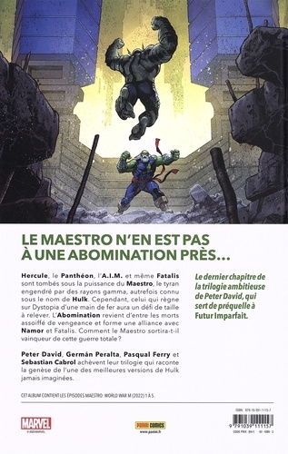 L'A. I. M. , le Panthéon... (même le Docteur Fatalis ! ) sont tombés face à la puissance du Maestro ! Mais le Titan de Jade ne devrait pas s'asseoir trop vite sur son trône, car l'Abomination est de retour d'entre les morts et pourrait bien représenter la pire des menaces pour son règne. D'autant qu'il a recruté de puissants alliés ! Ainsi se clôt la trilogie grâce à laquelle Peter David fait le lien entre la continuité Marvel et le cultissime Futur Imparfait, écrit il y a une trentaine d'années, où l'on retrouvait pour la première fois cette version futuriste et meurtrière de Hulk.