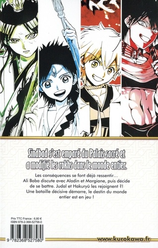 Vous êtes en manque de bonnes bastons et de bons délires ? Pourquoi ne pas vous plonger dans Magi - The Labyrinth of Magic : une aventure épique au coeur des 1001 nuits ! Sindbad s'est emparé du Palais sacré et a modifié les rokhs dans le monde entier. Les conséquences se font déjà ressentir... Ali Baba discute avec Aladin et Morgiane, puis décide de se battre. Judal et Hakuryû les rejoignent ? ! Une bataille décisive démarre, le destin du monde entier est en jeu !