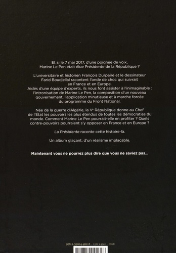 Le 7 mai 2017, Marine Le Pen est élue première Présidente de la République. Elle vient de battre François Hollande de quelques dizaines de milliers de voix. C’est l’effervescence sur les plateaux télé. Editorialistes, politologues, politiciens se succèdent, incrédules. Tard dans la nuit, des partisans de la nouvelle présidente fêtent la victoire. Des affrontements éclatent sporadiquement. La Présidente est un récit graphique d’anticipation politique, concentré sur les neuf premiers mois du mandat de Marine Le Pen, étayé par une parfaite connaissance des mécanismes économiques, médiatiques et institutionnels. Une plongée dans un futur incertain et chaotique.