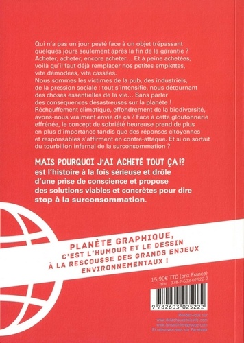 Qui n'a pas un jour pesté face à un objet trépassant quelques jours seulement après la fin de la garantie ? Acheter, acheter, encore acheter... Et à peine achetées, voilà qu'il faut déjà remplacer nos petites emplettes, vite démodées, vite cassées. Nous sommes les victimes de la pub, des industriels, de la pression sociale : tout s'intensifie, nous détournant des choses essentielles de la vie... Sans parler des conséquences désastreuses sur la planète ! Réchauffement climatique, effondrement de la biodiversité, avons-nous vraiment envie de ça ? Face à cette gloutonnerie effrénée, le concept de sobriété heureuse prend de plus en plus d'importance tandis que des réponses citoyennes et responsables s'affirment en contre-attaque. Et si on sortait du tourbillon infernal de la surconsommation ? MAIS POURQUOI J'AI ACHETE TOUT CA ! ? est l'histoire à la fois sérieuse et drôle d'une prise de conscience et propose des solutions viables et concrètes pour dire stop à la consommation. PLANETE GRAPHIQUE, C'EST L'HUMOUR ET LE DESSIN A LA RESCOUSSE DES GRANDS ENJEUX ENVIRONNEMENTAUX !