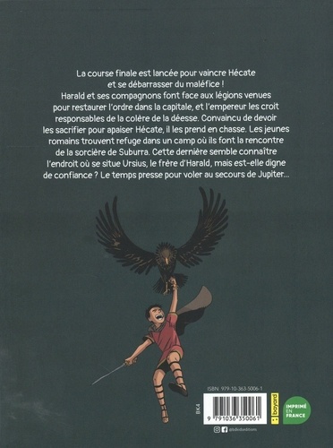 La course finale est lancée pour vaincre Hécate et se débarrasser du maléfice ! Harald et ses compagnons font face aux légions venues pour restaurer l'ordre dans la capitale, et l'empereur les croit responsables de la colère de la déesse. Convaincu de devoir les sacrifier pour apaiser Hécate, il les prend en chasse. Les jeunes romains trouvent refuge dans un camp où ils font la rencontre de la sorcière de Suburra. Cette dernière semble connaître l'endroit où se situe Ursius le frère d'Harald, mais est-elle digne de confiance ? Le temps presse pour voler au secours de Jupiter... Dans ce dernier tome de Maléfice sur Rome, découvrez la fin de l'aventure palpitante de Harald et Ursius ! Plongez dans l'univers frisson et historique de la série : les trois héros arriveront-ils à sauver Jupiter et libérer Rome de la malédiction ?