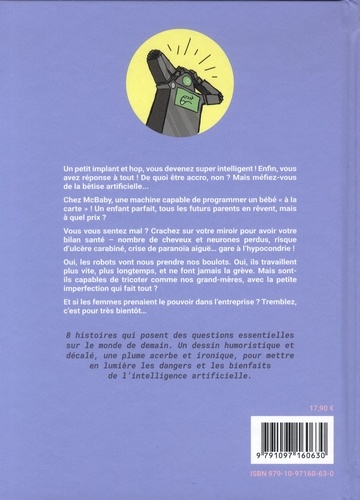 L'Intelligence artificielle croquée en bande-dessinée ! Voici 8 histoires, dont chacune pose des questions essentielles sur le monde de demain. Un dessin humoristique et décalé d'une part, une plume acerbe et ironique d'autre part, mettent en lumière les avantages et les dangers de l'Intelligence artificielle. Quelques synopsis : 1) Imaginez voir votre quartier en réalité augmentée grâce à l'implant " PLUS BELLE LA VILLE ". 2) N'oubliez pas de cracher tous les matins sur le miroir pour avoir votre bilan santé - cheveux et neurones perdus, transpiration, rythme cardiaque, tension artérielle, risque de cancer, stress, taux de graisse... gare à l'hypocondrie ! 3) Enfin une machine capable de programmer un bébé " à la carte ", tous les parents en rêvent ! Mais à quel coût ? Tout le monde pourra-t-il se l'offrir ? N'y-a-t-il pas un risque d'eugénisme ? Cela remet-il en question les relations sexuelles ? 4) Un petit implant et hop, vous devenez intelligent ! Voici de quoi être accro, non ? Mais il faut se méfier de la bêtise artificielle...