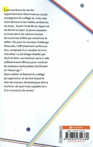 Les membres de Jardin appartiennent désormais au corps enseignant du collège et, très vite, Jûzô découvre les réelles ambitions du boss... Ayant l'intérêt du Japon et de Noren à coeur, le jeune assassin promet alors de vaincre toutes les Licornes d'élite qui viendront le défier ! Et pour le nouveau challenge Mitsuoka, l'affrontement se fera en duo, composé d'un cavalier et d'un chevalier. La stratégie établie par Jûzô et Shin, son binôme, sera-t-elle suffisamment efficace pour contrer les assauts impitoyables de Dömeki et Yatsurugi ? Sans oublier le festival du collège qui approche, et durant lequel le club de travaux domestiques devra montrer de quoi il est capable lors d'un concours de vente !