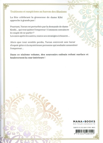 Trahisons et suspicions au harem des illusions. La fête célébrant la grossesse de dame Kihi approche à grands pas ! Pourtant, Yuran est perturbée par la demande de dame Kenhi... qui veut quitter l'empereur ! Comment convaincre le couple de se parler ? Les unes après les autres, toutes ses stratégies échouent... Alors que tout semble perdu, Yuran entrevoit une lueur d'espoir grâce à la mystérieuse personne qui souhaite assassiner l'empereur... Dans ce sixième volume, des souvenirs enfouis refont surface et bouleversent la cour intérieure !