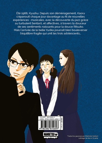 Eté 1966, Kyushu. Depuis son déménagement, Kaoru s'épanouit chaque jour davantage au fil de nouvelles expériences : musicales, avec la découverte du jazz grâce au turbulent Sentarô, et affectives, à travers la douceur de ses sentiments naissants pour la douce Ritsuko. Mais l'arrivée de la belle Yurika pourrait bien bouleverser l'équilibre fragile qui unit les trois adolescents... (Re)découvrez la série culte de Yuki Kodama (The Blue Flowers & The Ceramic Forest), lauréate du prix Shogakukan en 2012. Un josei vibrant autour du jazz dans le Japon des années 1960, sur fond de bouleversements sociaux.