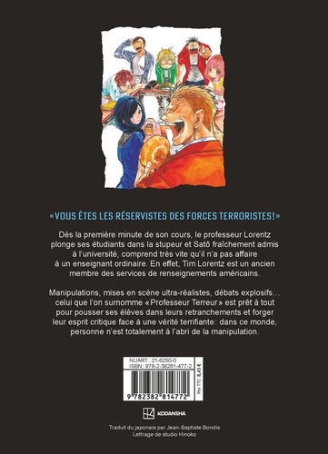 "Vous êtes les réservistes des forces terroristes ! " Les étudiants de l'université Baba se pressent au terrifiant séminaire de Tim Lorentz, qui brise toutes les croyances sur les sectes et organisations terroristes. Savez-vous pourquoi les sectes recrutent dans les rues et dans les universités ? Pourquoi les terroristes commettent des attentats-suicides ? Au fond... qui peut dire ce qu'est réellement le terrorisme ? Le professeur terreur est là pour tout vous révéler : une vérité effrayant à connaitre, mais encore plus à ignorer...