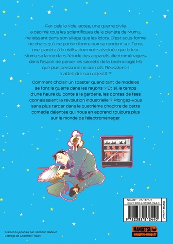 Par-delà la Voie lactée, une guerre civile a décimé tous les scientifiques de la planète de Mumu, ne laissant dans son sillage que les idiots. C'est sous forme de chats qu'une partie d'entre eux se rendent sur Terre, une planète à la civilisation moins évoluée que la leur. Mumu se lance dans l'étude des appareils électroménagers, dans l'espoir de percer les secrets de la technologie mû que plus personne ne connaît. Réussira-t-il à atteindre son objectif ? Comment choisir un toaster quand tant de modèles se font la guerre dans les rayons ? Et si, le temps d'une heure du conte à la garderie, les contes de fées connaissaient la révolution industrielle ? Plongez-vous sans plus tarder dans le quatrième chapitre de cette comédie déjantée qui nous en apprend toujours plus sur le monde de l'électroménager. Miyashita Hiroki dévoile tout son savoir-faire dans Uchujin Mumu : découvrez les aventures d'un chat extraterrestre, où science-fiction, humour et électroménager se rencontrent pour un mélange unique et inoubliable !