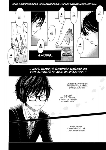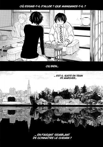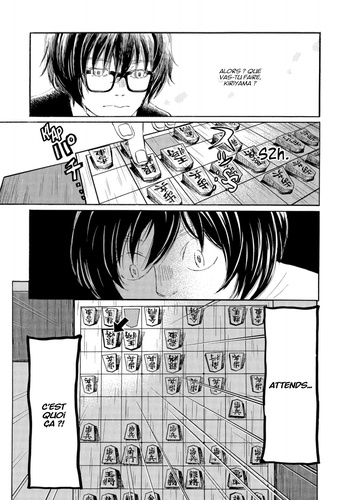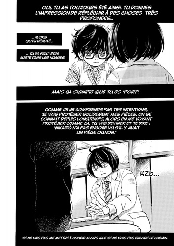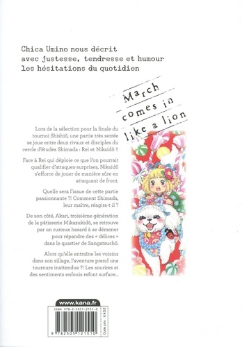 Lors de la sélection pour la finale du tournoi Shishiô, une partie très serrée se joue entre deux rivaux et disciples du cercle d'études Shimada : Rei et Nikaidô !! Face à Rei qui déploie ce que l'on pourrait qualifier d'attaques-surprises, Nikaidô s'efforce de jouer de manière sûre en attaquant de front. Quelle sera l'issue de cette partie passionnante ? ! Comment Shimada, leur maître, réagira-t-il ? De son côté, Alcali, troisième génération de la pâtisserie Mikazukidô, se retrouve par un curieux hasard à se démener pour répandre des "délices" dans le quartier de Sangatsuchô. Alors qu'elle entraîne les voisins dans son sillage, l'aventure prend une tournure inattendue ? ! Les sourires et des sentiments enfouis refont surface...
