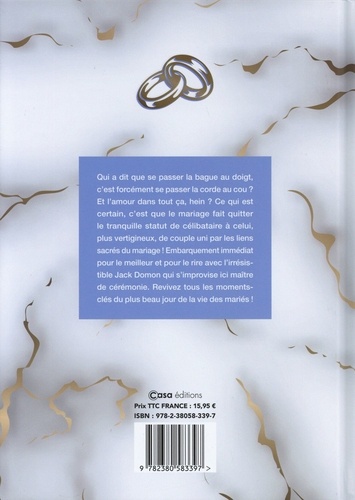 Le livre d'humour sur le thème du mariage, juste avant le Salon du mariage (fin janvier) et la Saint Valentin (14 février) Qui a dit que se passer la bague au doigt, c'est forcément se passer la corde au cou ? Et l'amour dans tout ça, hum ? Ce qui est certain, c'est que le mariage fait quitter le tranquille statut de célibataire à celui, plus vertigineux, de couple uni par les liens sacrés du mariage ! Embarquement immédiat pour le meilleur et pour le pire avec ce livre savamment orchestré par l'irrésistible Jack Domon qui s'improvise ici maître de cérémonie. Revivez tous les moments clé du plus jour de la vie des mariés !