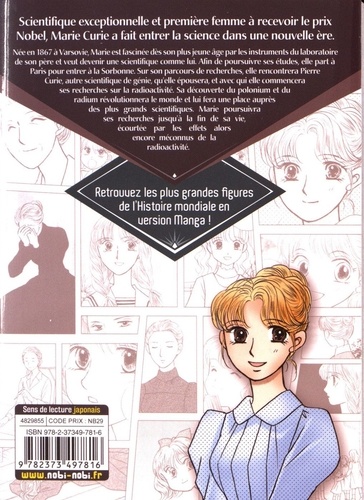 Scientifique exceptionnelle et première femme à recevoir le prix Nobel, Marie Curie a fait rentrer la science dans une nouvelle ère. Née en 1867 à Varsovie, Marie est fascinée dès son plus jeune âge par les instruments du laboratoire de son père et veut devenir une scientifique comme lui. Afin de poursuivre ses études, elle part à Paris pour entrer à la Sorbonne. Sur son parcours de recherches, elle rencontrera Pierre Curie, autre scientifique de génie, qu'elle épousera, et avec qui elle commencera ses recherches sur la radioactivité. Sa découverte du polonium et du radium révolutionnera le monde et lui fera une place auprès des plus grands scientifiques. Marie poursuivra ses recherches jusqu'à la fin de sa vie, écourtée par les effets alors encore méconnus de la radioactivité.