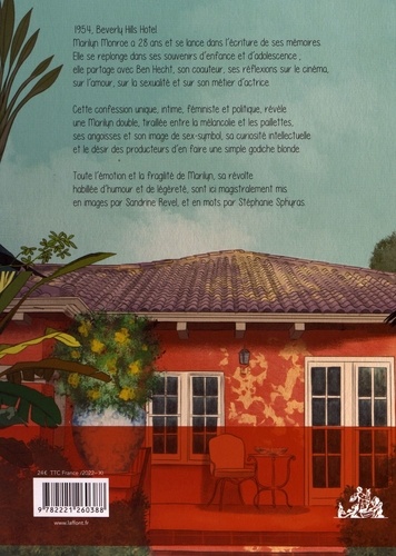 Marilyn par Marilyn. 1954, Berverly Hills Hotel. Marilyn Monroe a 28 ans et se lance dans l'écriture de ses mémoires. Elle se replonge dans ses souvenirs d'enfance et d'adolescence ; elle partage avec Ben Hecht, son co-auteur, ses reflexions sur le cinéma, sur l'amour, sur la sexualité et sur son métier d'actrice. Cette confession unique, intime, féministe et politique, révèle une Marilyn double, tiraillée entre la mélancolie et les paillettes, ses angoisses et son image de sex-symbol, sa curiosité intellectuelle et de désir des producteurs d'en faire une simple godiche blonde. Toute l'émotion et la fragilité de Marilyn, sa révolte habillée d'humour et de légèreté, sont ici magistralement mis en images par Sandrine Revel, et en mots par Stéphanie Sphyras.