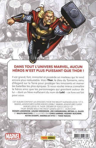 Dans tout l'univers Marvel, aucun héros n'est plus puissant que Thor ! Il est grand, fort, immortel et possède un marteau qui le rend encore plus redoutable. Voici Thor, le dieu du Tonnerre, venu d'Asgard sur la Terre pour protéger les innocents et mener les batailles les plus épiques. Si vous voulez mieux connaître le héros ainsi que les personnages qui gravitent autour de lui - dont un frère malfaisant du nom de Loki - ce livre est fait pour vous. Cet album contient les épisodes Thor the Mighty Avengers (2010) 1 et 2, Marvel Adventures Super Heroes (2010) 19, Thor : Crown of Fools (2013) 1, et Thor : Where Walk The Frost Giants (2017) 1 - écrits par Roger Langridge, Louise Simonson, Joe Caramagna, Bryan J.L. Glass et Ralph Macchio, et illustrés par Chris Samnee, Rodney Buchemi, Kevin Sharpe, Andrea di Vito et Todd Nauck.