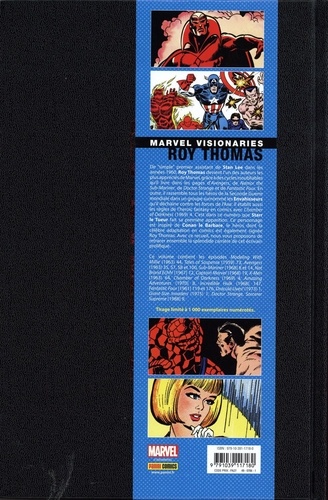 Nombreux sont les auteurs qui ont marqué l'histoire de la Maison des Idées, depuis Stan Lee et Jack Kirby jusqu'aux superstars actuelles que sont par exemple Brian Michael Bendis ou Jason Aaron. Roy Thomas fait partie des auteurs qui ont participé à la légende, dès les années 60. Les Avengers, Namor, les X-Men, Hulk, les Quatre Fantastiques et bien d'autres... ils sont tous là ! Nos albums VISIONARIES sont un régal pour les collectionneurs. L'oeuvre de Roy Thomas passe par des séries très connues comme Avengers ou X-Men, mais aussi par des récits plus surprenants de l'univers Marvel, tels Chamber of Darkness ou Modeling With Millie ! Voici un bel aperçu d'une carrière éclectique.