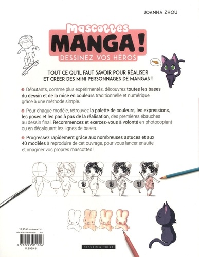 Tout ce qu'il faut savoir pour réaliser et créer des mini personnages de mangas ! Débutants, comme plus expérimentés, découvrez toutes les bases du dessin et de la mise en couleurs traditionnelle et numérique grâce à une méthode simple. Pour chaque modèle, retrouvez la palette de couleurs, les expressions, les poses et les pas à pas de la réalisation, des premières ébauches au dessin final. Recommencez et exercez-vous à volonté en photocopiant ou en décalquant les lignes de bases. Progressez rapidement grâce aux nombreuses astuces et aux 40 modèles à reproduire de cet ouvrage, pour vous lancer ensuite et imaginer vos propres mascottes !