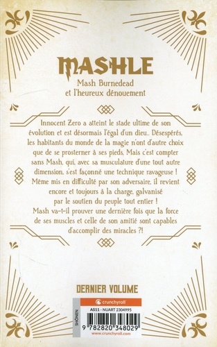 Innocent Zero a atteint le stade ultime de son évolution et est désormais l'égal d'un dieu... Désespérés, les habitants du monde de la magie n'ont d'autre choix que de se prosterner à ses pieds. Mais c'est compter sans Mash, qui, avec sa musculature d'une tout autre dimension, s'est façonné une technique ravageuse ! Même mis en difficulté par son adversaire, il revient encore et toujours à la charge, galvanisé par le soutien du peuple tout entier ! Mash va-t-il prouver une dernière fois que la force de ses muscles et celle de son amitié sont capables d'accomplir des miracles ? !